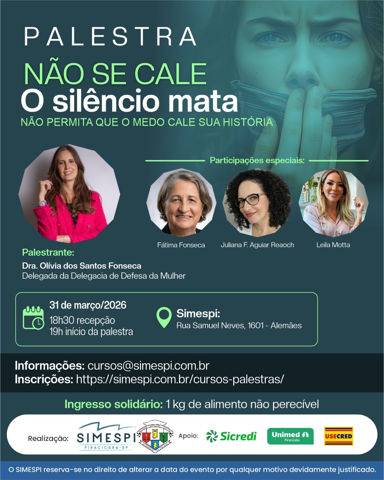 PALESTRA: NÃO SE CALE, O SILÊNCIA MATA ! Palestrante: Dra. Olivia dos Santos Fonseca - Delegada da Delegacia de Defesa da Mulher.